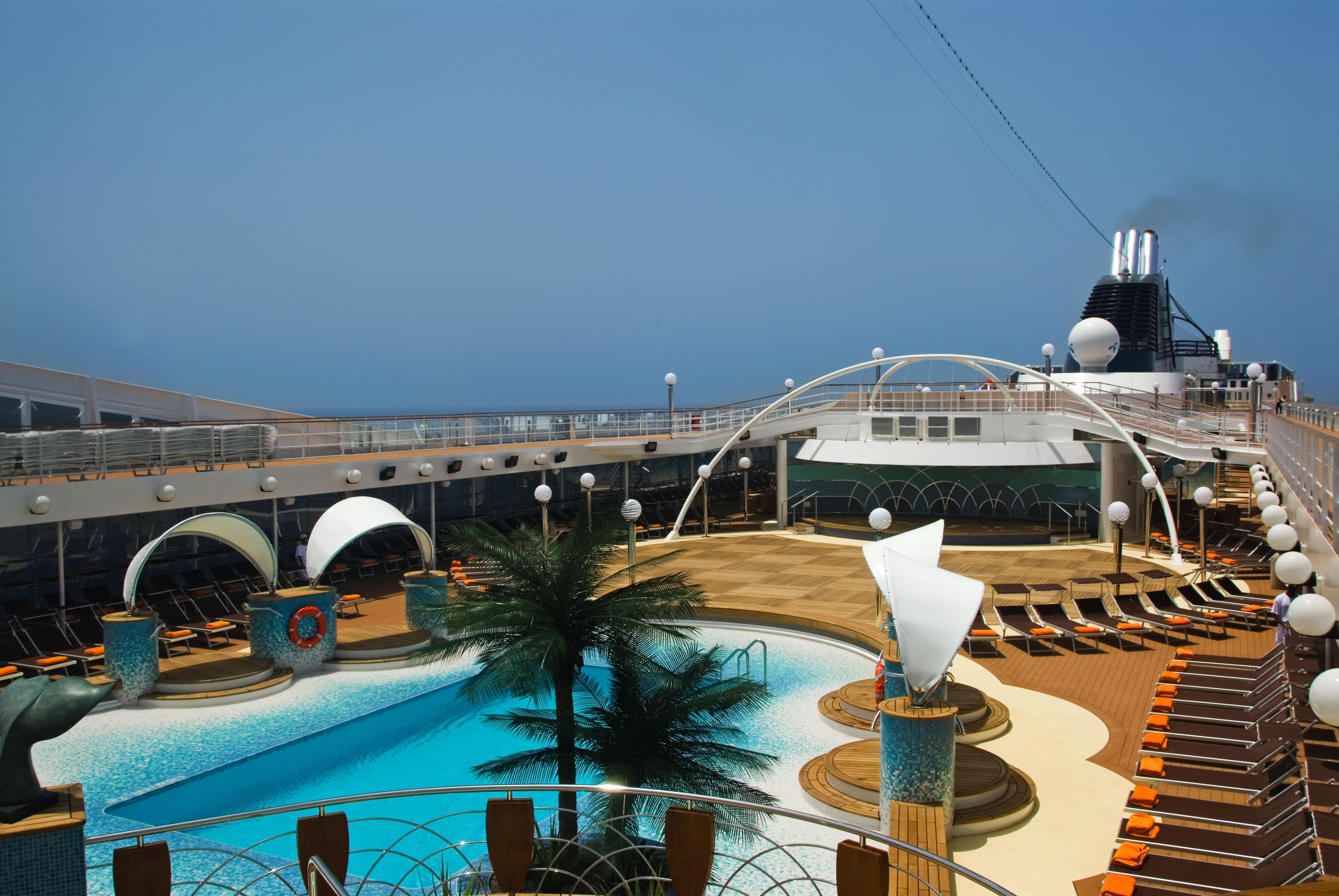 The pool deck offers lovely pools and jacuzzis by day and film screenings by night.